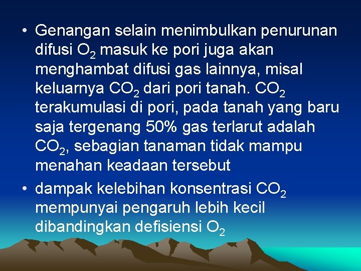 • Genangan selain menimbulkan penurunan difusi O 2 masuk ke pori juga akan menghambat difusi gas lainnya, misal keluarnya CO 2 dari pori tanah. CO 2 terakumulasi di pori, pada tanah yang baru saja tergenang 50% gas terlarut adalah CO 2, sebagian tanaman tidak mampu menahan keadaan tersebut • dampak kelebihan konsentrasi CO 2 mempunyai pengaruh lebih kecil dibandingkan defisiensi O 2