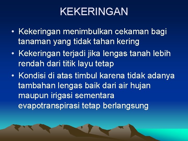 KEKERINGAN • Kekeringan menimbulkan cekaman bagi tanaman yang tidak tahan kering • Kekeringan terjadi jika lengas tanah lebih rendah dari titik layu tetap • Kondisi di atas timbul karena tidak adanya tambahan lengas baik dari air hujan maupun irigasi sementara evapotranspirasi tetap berlangsung