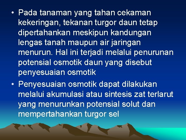 • Pada tanaman yang tahan cekaman kekeringan, tekanan turgor daun tetap dipertahankan meskipun kandungan lengas tanah maupun air jaringan menurun. Hal ini terjadi melalui penurunan potensial osmotik daun yang disebut penyesuaian osmotik • Penyesuaian osmotik dapat dilakukan melalui akumulasi atau sintesis zat terlarut yang menurunkan potensial solut dan mempertahankan turgor sel