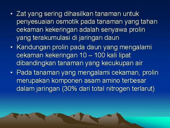 • Zat yang sering dihasilkan tanaman untuk penyesuaian osmotik pada tanaman yang tahan cekaman kekeringan adalah senyawa prolin yang terakumulasi di jaringan daun • Kandungan prolin pada daun yang mengalami cekaman kekeringan 10 – 100 kali lipat dibandingkan tanaman yang kecukupan air • Pada tanaman yang mengalami cekaman, prolin merupakan komponen asam amino terbesar dalam jaringan (30% dari total nitrogen terlarut)