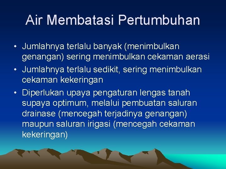 Air Membatasi Pertumbuhan • Jumlahnya terlalu banyak (menimbulkan genangan) sering menimbulkan cekaman aerasi • Jumlahnya terlalu sedikit, sering menimbulkan cekaman kekeringan • Diperlukan upaya pengaturan lengas tanah supaya optimum, melalui pembuatan saluran drainase (mencegah terjadinya genangan) maupun saluran irigasi (mencegah cekaman kekeringan)