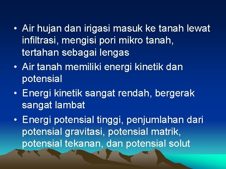 • Air hujan dan irigasi masuk ke tanah lewat infiltrasi, mengisi pori mikro tanah, tertahan sebagai lengas • Air tanah memiliki energi kinetik dan potensial • Energi kinetik sangat rendah, bergerak sangat lambat • Energi potensial tinggi, penjumlahan dari potensial gravitasi, potensial matrik, potensial tekanan, dan potensial solut