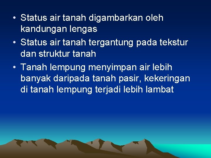 • Status air tanah digambarkan oleh kandungan lengas • Status air tanah tergantung pada tekstur dan struktur tanah • Tanah lempung menyimpan air lebih banyak daripada tanah pasir, kekeringan di tanah lempung terjadi lebih lambat