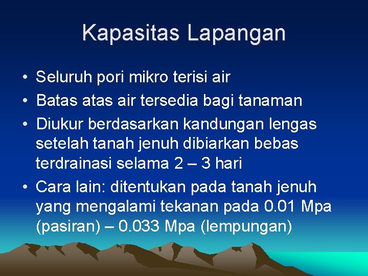 Kapasitas Lapangan • Seluruh pori mikro terisi air • Batas air tersedia bagi tanaman • Diukur berdasarkan kandungan lengas setelah tanah jenuh dibiarkan bebas terdrainasi selama 2 – 3 hari • Cara lain: ditentukan pada tanah jenuh yang mengalami tekanan pada 0. 01 Mpa (pasiran) – 0. 033 Mpa (lempungan)