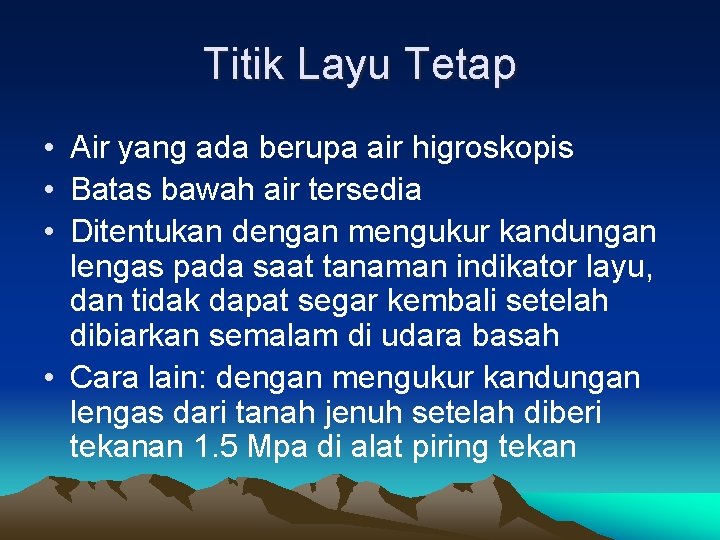 Titik Layu Tetap • Air yang ada berupa air higroskopis • Batas bawah air tersedia • Ditentukan dengan mengukur kandungan lengas pada saat tanaman indikator layu, dan tidak dapat segar kembali setelah dibiarkan semalam di udara basah • Cara lain: dengan mengukur kandungan lengas dari tanah jenuh setelah diberi tekanan 1. 5 Mpa di alat piring tekan