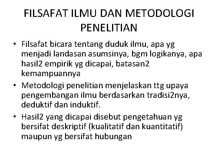 FILSAFAT ILMU DAN METODOLOGI PENELITIAN • Filsafat bicara tentang duduk ilmu, apa yg menjadi landasan asumsinya, bgm logikanya, apa hasil 2 empirik yg dicapai, batasan 2 kemampuannya • Metodologi penelitian menjelaskan ttg upaya pengembangan ilmu berdasarkan tradisi 2 nya, deduktif dan induktif. • Hasil 2 yang dicapai disebut pengetahuan yg bersifat deskriptif (kualitatif dan kuantitatif) maupun yg bersifat hubungan