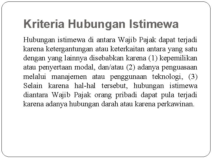 Kriteria Hubungan Istimewa Hubungan istimewa di antara Wajib Pajak dapat terjadi karena ketergantungan atau keterkaitan antara yang satu dengan yang lainnya disebabkan karena (1) kepemilikan atau penyertaan modal, dan/atau (2) adanya penguasaan melalui manajemen atau penggunaan teknologi, (3) Selain karena hal-hal tersebut, hubungan istimewa diantara Wajib Pajak orang pribadi dapat pula terjadi karena adanya hubungan darah atau karena perkawinan.