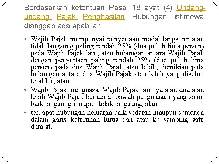 Berdasarkan ketentuan Pasal 18 ayat (4) Undangundang Pajak Penghasilan Hubungan istimewa dianggap ada apabila : • Wajib Pajak mempunyai penyertaan modal langsung atau tidak langsung paling rendah 25% (dua puluh lima persen) pada Wajib Pajak lain, atau hubungan antara Wajib Pajak dengan penyertaan paling rendah 25% (dua puluh lima persen) pada dua Wajib Pajak atau lebih, demikian pula hubungan antara dua Wajib Pajak atau lebih yang disebut terakhir; atau • Wajib Pajak menguasai Wajib Pajak lainnya atau dua atau lebih Wajib Pajak berada di bawah penguasaan yang sama baik langsung maupun tidak langsung; atau • terdapat hubungan keluarga baik sedarah maupun semenda dalam garis keturunan lurus dan atau ke samping satu derajat.