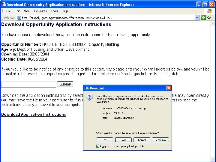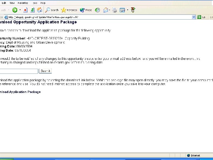 HUD’s Grants. gov Statistics • Received its first electronic application May 22, 2004. • Housing Counseling Training NOFA received 18 applications electronically by the deadline. • Grants. gov support was able to handle all transmission questions posed by applicants.