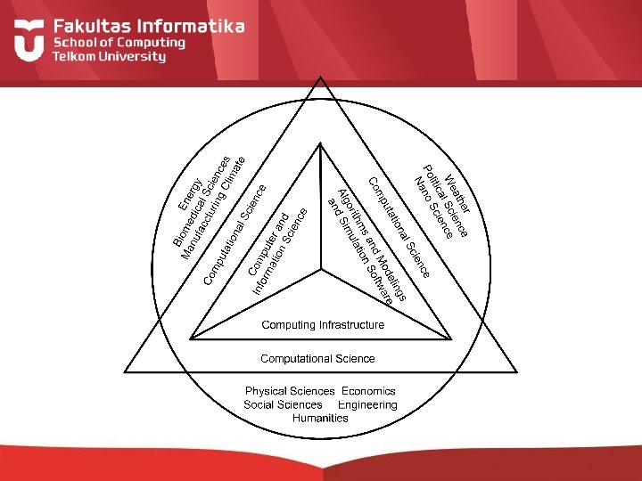 Computational science is a rapidly growing multidisiplinary field that uses advanced computing capabilities to understand solve complex problems. Computational Science fuses three distinct elements: Algorithms (numerical and non-numerical) and modeling and simulation software developed to solve science, engineering, and humanities problems Computer and information science that develops and optimizes the advanced system hardware, software, networking, and data management components needed to solve computationally demanding problems The computing infrastructure that support both the science and engineering problem solving and developmental computer and information science US President’s Information Technology Advisory Committee