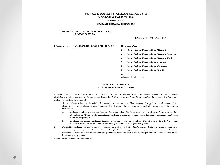 SURAT KUASA PADA PERKARA PERDATA § § § Berbentuk Surat Kuasa Khusus; Makna “khusus” pada surat kuasa, yaitu khusus untuk melakukan perbuatan hukum tertentu dan dalam tingkat peradilan tertentu; Surat kuasa khusus dapat dibuat secara tertulis dan dapat juga dikemukakan secara lisan di muka Hakim; Bentuk surat kuasa khusus dapat dibuat di bawah tangan atau dalam bentuk akta otentik; apabila Pemberi Kuasa buta huruf, maka surat kuasa harus dalam bentuk otentik atau dapat juga dalam bentuk di bawah tangan namun harus dilegalisasi di hadapan pejabat umum yang berwenang; Apabila surat kuasa memuat klausula subtitusi, maka Penerima Kuasa berhak melimpahkan/ mensubtitusikan surat kuasa tersebut kepada pihak lain. Pelimpahan/ subtitusi tersebut dapat dilakukan secara permanen atau temporer