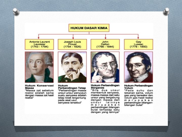 Hukum Kekekalan Massa (Hukum Lavoisier) Antonie Laurent Lavoisier (1743 -1794). Lahir di Paris anak seorang ahli hukum. Lavoiser dipandang sebagai bapak Ilmu Kimia Modern.