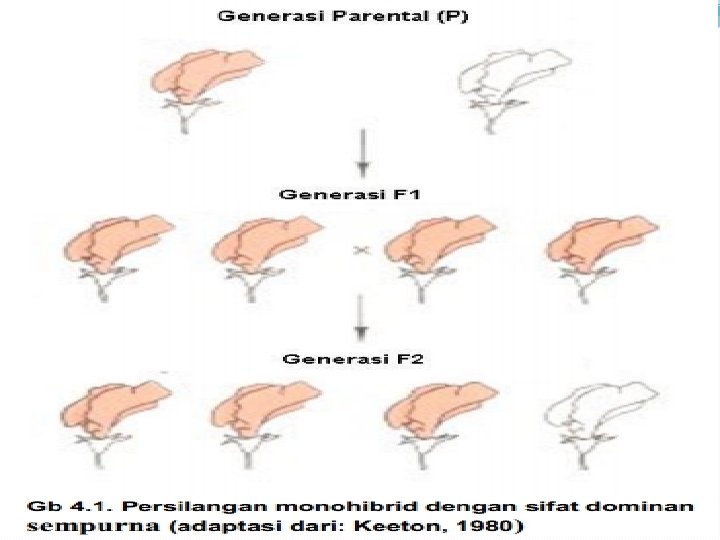 Istilah Dominan: Sifat yang muncul hasil persilangan dari salah satu induk dengan mengalahkan sifat pasanganya. Resesif: Sifat yang tidak muncul (teresembunyi) pada keturunanya karena dikalahkan oleh sifat pasanganya. Dominasi penuh: Gen dominan akan terlihat menutupi pengaruh gen resesif. Dominasi tak penuh: Ada fenotipe F 1 yang tidak sama dengan salah satu fenotipe induk melainkan mempunyai sifat diantara kedua gen dominan dan gen resesif.