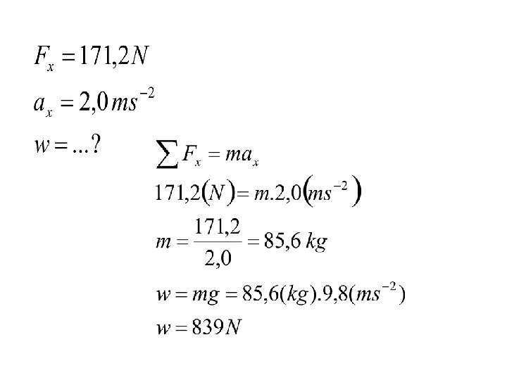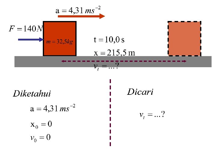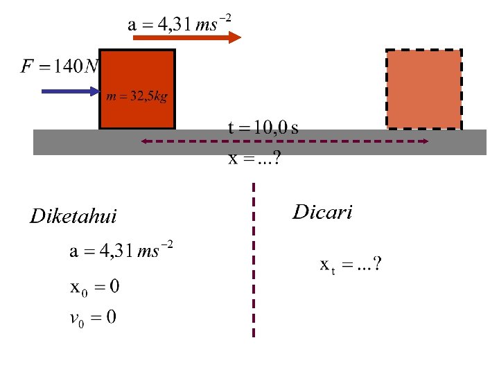Contoh Soal 2. Sebuah peti yang memiliki massa 32, 5 kg dalam keadaan diam di atas lantai gudang, mengalami gaya mendatar sebesar 140 N. a) berapa besar percepatan yang dihasilkan? b) Berapa jauh peti bergerak dalam waktu 10, 0 s? c) Berapa kecepatannya setelah 10, 0 s?