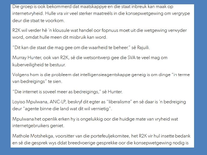 Navorsing • Internetsoektogte • Krakerwebborde: hackers. co. za • Artikel oor Suid-Afrikaanse krakers • Die prokureur • Die kuberkrakers