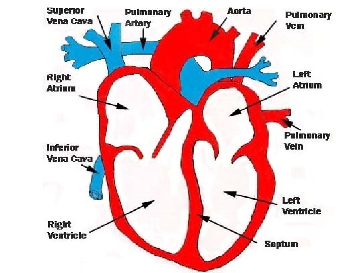CIRCULATORY SYSTEM • Function is to carry oxygen, food and nutrients to all the body parts, carry wastes away, fight infections and help heal wounds. • Arteries carry blood away from the heart; capillaries connect arteries and veins together and allow nutrients and oxygen to diffuse into cells; veins carry blood back to the heart to pick up oxygen and nutrients. • There are four chambers; upper chambers are atriums (right and left atrium); lower chambers ventricles (right and left ventricle) • Three types of circulation: – Coronary Circulation-flow of blood to and from the heart – Pulmonary Circulation- flow of blood from heart to lungs back to the heart – Systemic Circulation-flow of blood to body tissue and organs except the heart or lungs