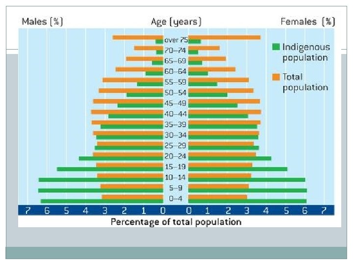 More babies but lower life expectancy � The Indigenous age–sex population structure is different from the total Australian structure. Indigenous people have higher fertility and higher death rates, and their population is younger than the total Australian population. Although fertility rates for Indigenous women fell to 2. 1 babies per woman by 2006, this is still higher than the fertility rate of 1. 7 babies per woman in the total Australian female population. The high death rate is reflected in a life expectancy of 59 years for males and 65 years for females. Only 3 per cent of the Indigenous population are over 65 years, compared with 13 per cent of the total population. This is a result of poorer health from higher rates of smoking, obesity, diabetes, asthma and kidney diseases compared with the rest of the population. On a positive note, more babies are reaching their fifth birthday with a decrease in the infant mortality rate, helped by government health services, nongovernment organisations (NGOs) and Indigenous community health programs.