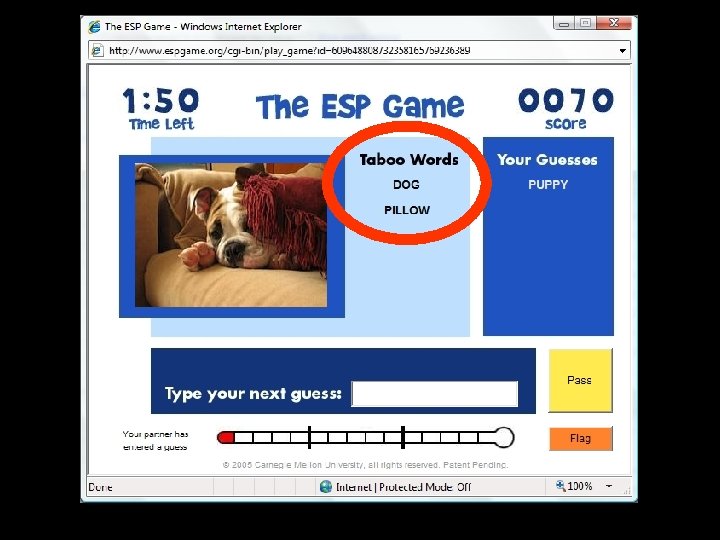 “ Many fascinating things about the ESP Game: How it uses a game structure to build an index of images on the web What words become taboo from frequent use How interesting some of the images pulled randomly from the web are But by far the most intriguing aspect of the game is how often your random, unknown partner is a complete idiot. ”