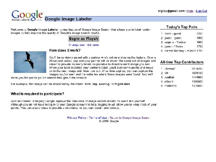 Labeling The Entire Web 5000 people playing simultaneously can label all images on Google in 2 months! Individual games in Yahoo! and MSN average over 5, 000 players at a time