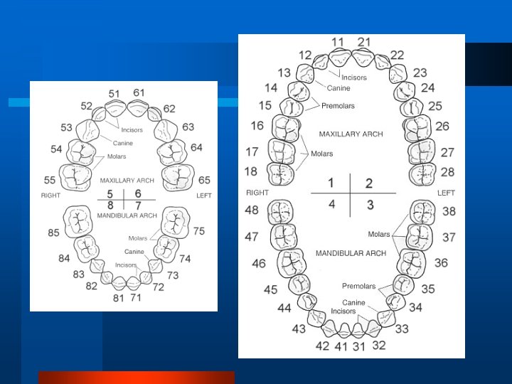 It represents the four quadrants of the dentition as if you are facing the patient. In upper right In upper left In lower right In lower left Horizontal and vertical lines = symbol for the quadrant The permanent teeth are numbered from 1 -8 on each side from the midline. Upper right Upper left 8 7 6 5 4 3 2 1 1 2 3 4 5 6 7 8 Lower right Lower left