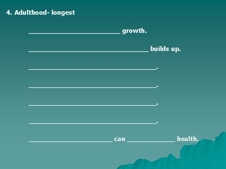 3. Adolescence male 10 -12 - 18 yr female 8 -11 – 16 a. Physiological changes ________________ reaches _________________ develop. ____________ Males max. height is reach ______ yrs. old. Female max. height is reached _______ yrs old.
