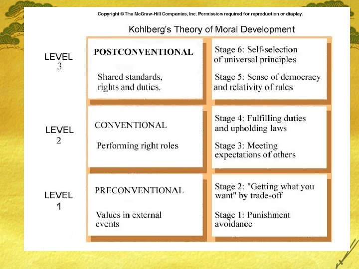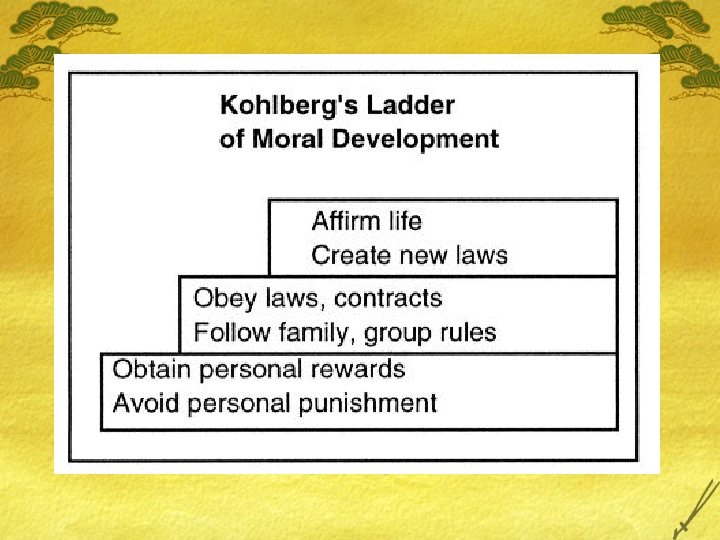 Kohlberg …and Finally Kohlberg had two dreams. . . neither of which he met. 1. Kohlberg worked with prisoners to try and raise their moral reasoning to stage four. 2. Kohlberg worked with adolescents in schools in Boston to try and do much the same he’d been trying to do with prisoners. £ His health was deteriorating (intestinal parasite). £ He became deeply depressed. £ Discussed the moral issue of suicide. . . On January 17, 1987, his car was found was a tidal pool outside of Boston. . . . In April, his body washed up at Logan Airport.
