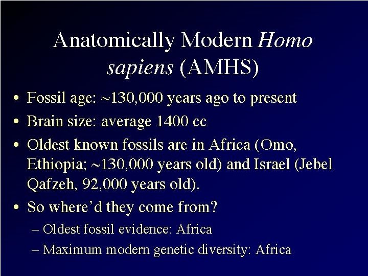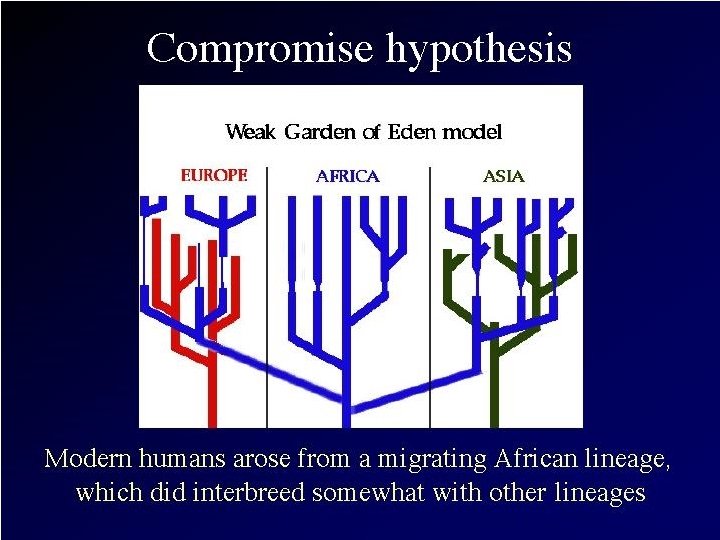 n n Compromise (Mostly Out of Africa) About 130, 000 years ago, the first anatomically modern Homo sapiens evolved in East Africa (probably from H. erectus) and then migrated out of Africa to Europe, Asia, & rest of world. At this point, H. sapiens did interbreed with members of other species (H. erectus & H. Neanderthalensis)