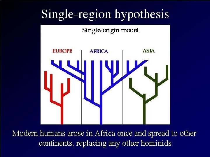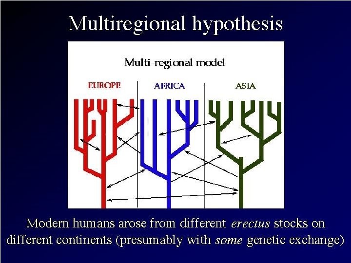 Multiregional Hypothesis n n n 1. 8 mya, Homo erectus evolved in East Africa and then began to migrate to Europe and Asia (due to lack of water and shelter) A very successful species, H. erectus survived until 33, 000 years ago! So…the Multiregional hypothesis argues that modern H. sapiens evolved from the different H. erectus stocks in different regions (continents) at the same time. After H. sapiens evolved in these different regions, may have been interbreeding, thus sharing of genes.