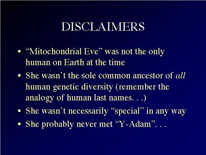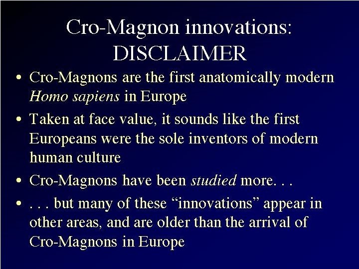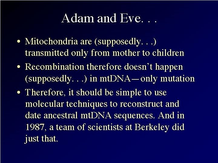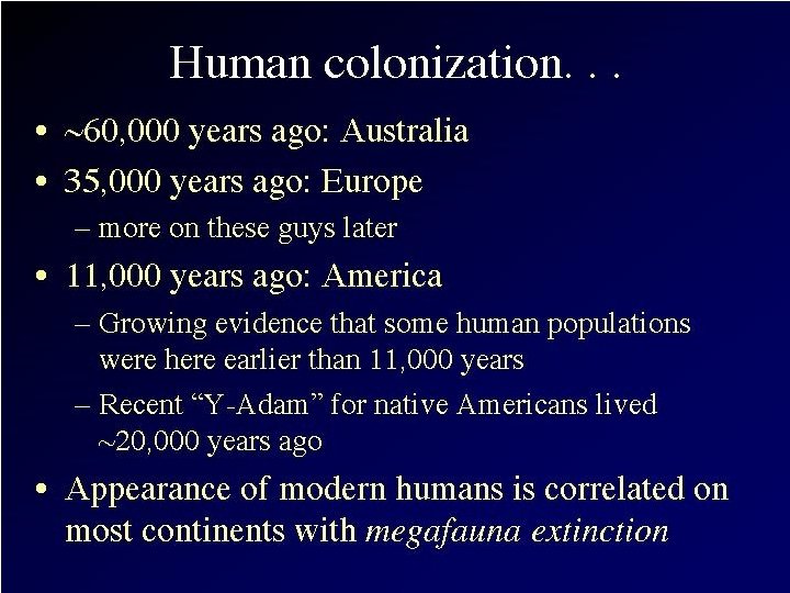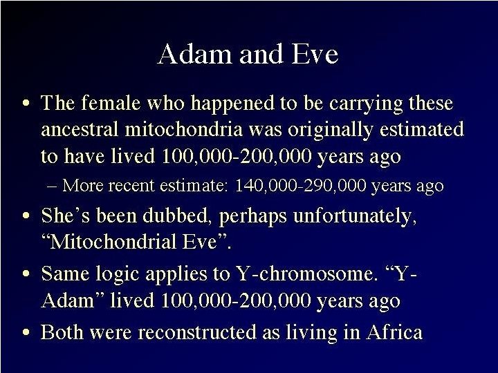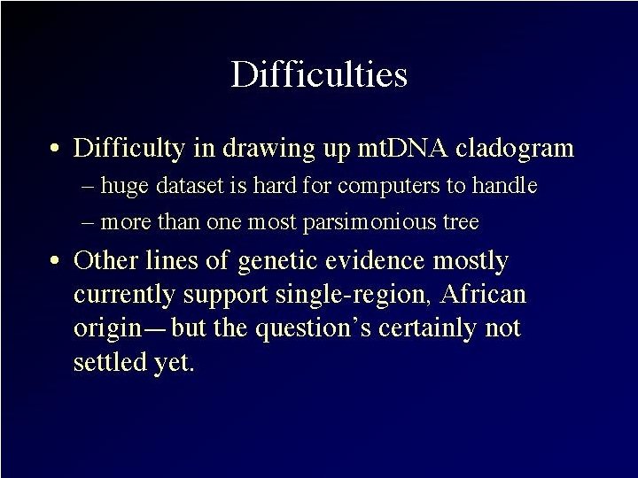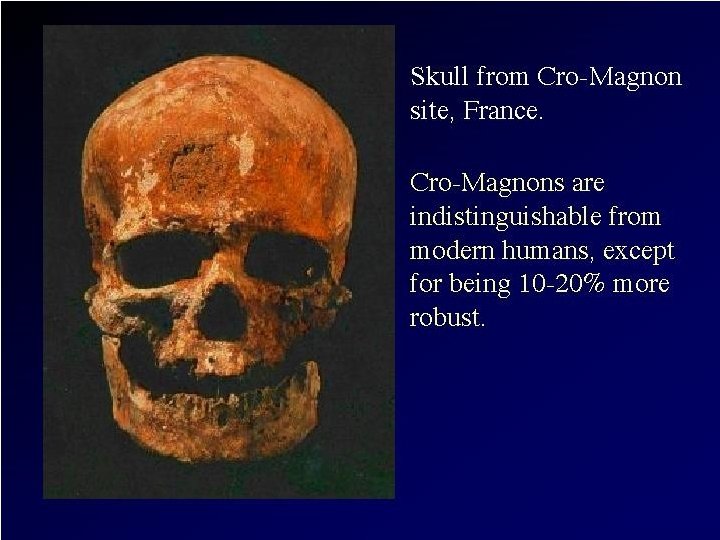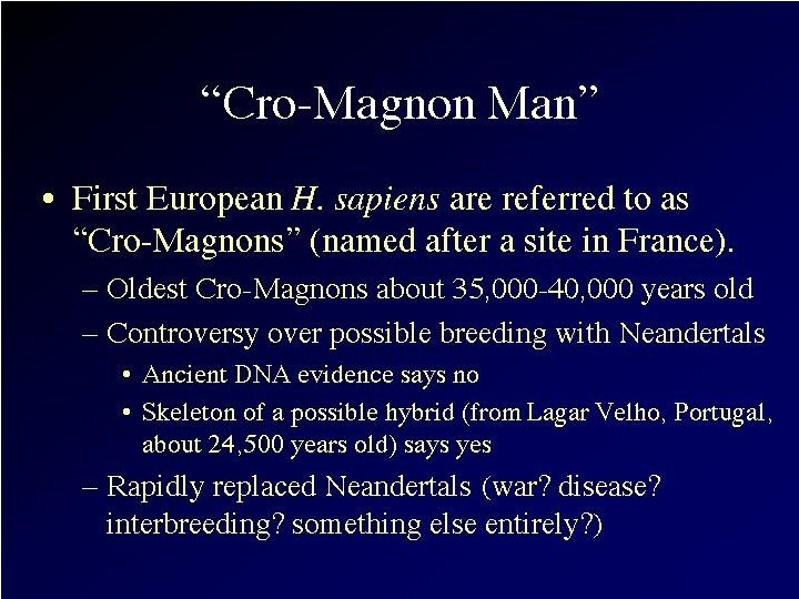 Recent Research: “Mungo Man” • Part of m. DNA extracted recently from bones of a 60, 000 year old modern Homo sapiens skeleton found in 1974 on the shores of Lake Mungo in Australia • Oldest DNA extracted from a human so far! • Comparison of this DNA with that of 9 other ancient Australian skeletons, 2 Neanderthals, and 3, 453 contemporary people from around the world indicates: "Mungo Man" had a unique genetic marker • Indicates that a now lost genetic line of modern Homo sapiens existed in Australia BEFORE arrival of later Australian Aborigines • This evidence provides significant support for rejecting the "out of Africa" complete replacement model of modern Homo sapiens evolution