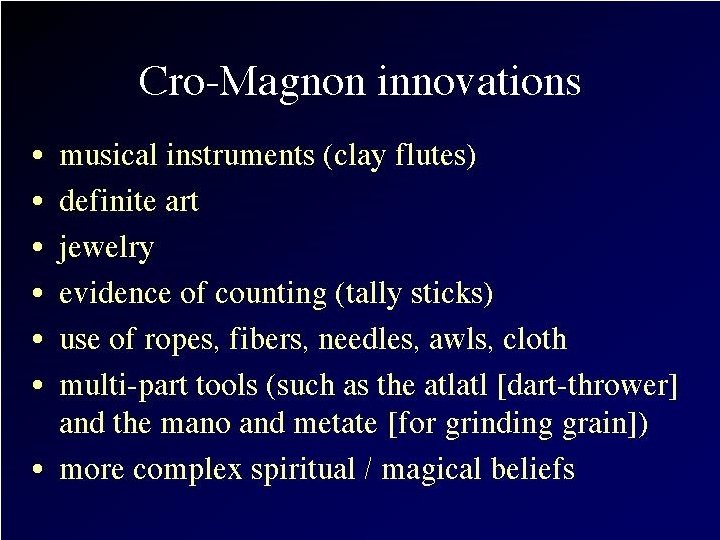 6. Homo neanderthalensis n n 28, 000 ya – 225, 000 ya Belgium, Croatia, Germany, France, Iraq, Israel, Italy (p. 297) Increased Brain Size (1200 -1700 ml) “Retouched flakes” (tool use), big game hunters, buried dead, cave art, early language? , compassion