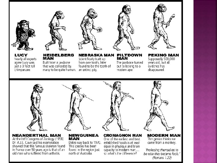 Jean Baptiste de Lamarck – a zoologist, developed a number of theories on how animals species develop over time; from simple forms into more complex (ie. Giraffes and long necks for food) Charles Darwin (1809 - 1882) – the one everyone knows for theory of evolution; gradual change over generations and survival of the fittest (natural selection) - when his works were first published they created a huge controversy “is it from your mother’s side or your father’s side that you are descended from apes”