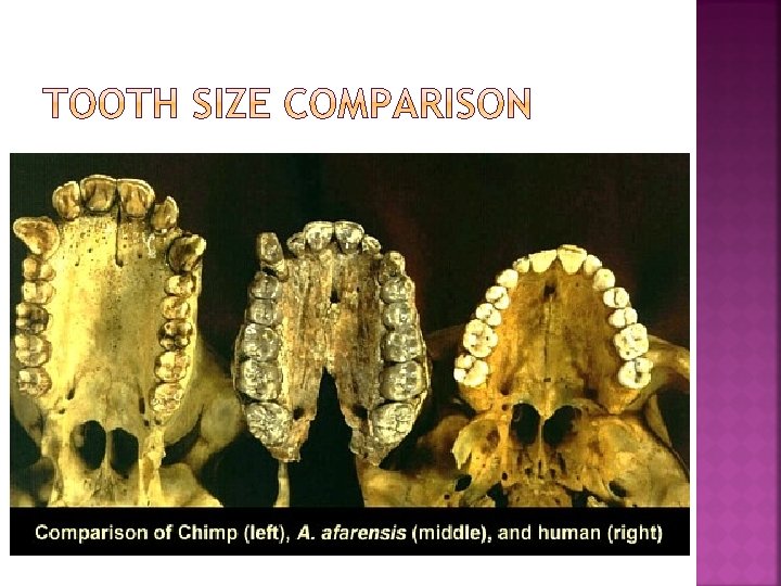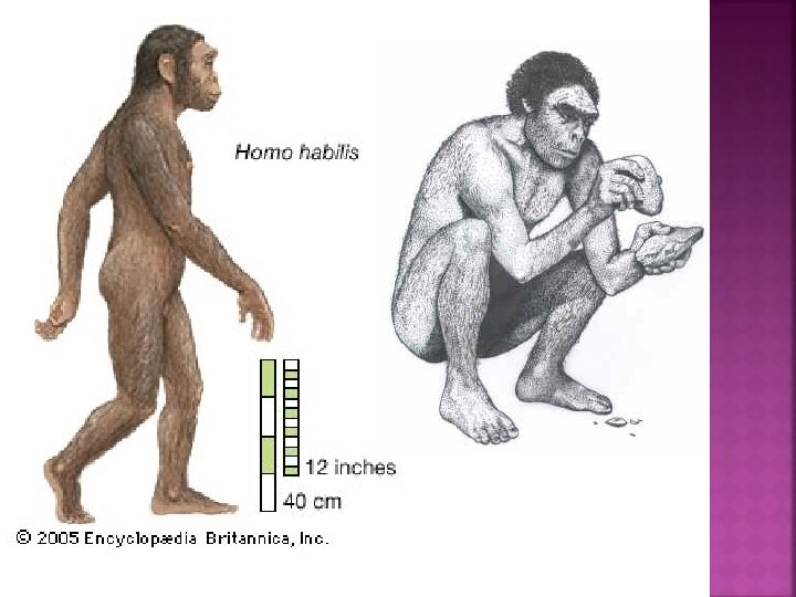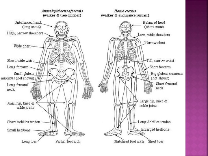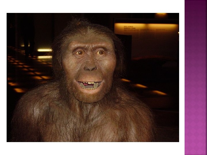 1. 5 – 4 million years ago First fossils found in 1924, a young child Small brain capacity 450 - 500 cm 3 Large brows and flat forehead Mary Leakey discovered a complete skull 1959 in Tanzania Donald Johanson in 1974 discovered the remains of the most complete specimen ever found – known as “Lucy” They may have used primitive tools, but little evidence