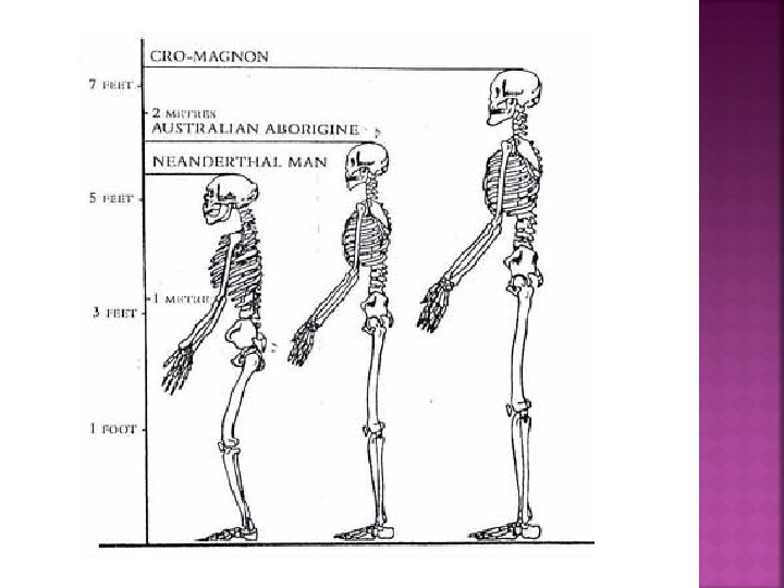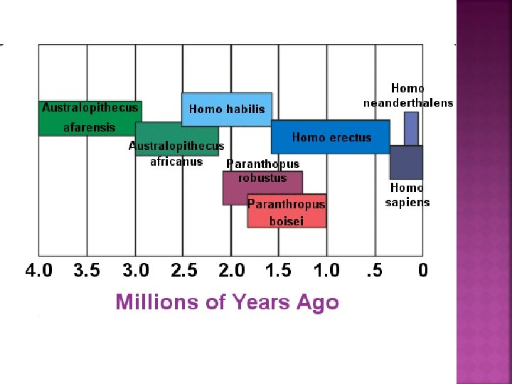 Australopithecus 1. 5 – 4 million years ago Homo Neanderthalis 35, 000 – 85, 000 years ago Homo Habilis 1. 75 million years Cro-Magnon ago 10, 000 - 35, 000 years ago Homo Erectus 300, 000 -1. 5 million years ago 10, 000 - present years ago (but not always in class) Homo Sapiens
