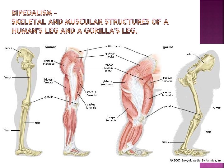 Several differences allow the human being to walk erect on two legs with a striding gait rather than move in a knuckle-walking fashion like the gorilla – one example includes: in the legs the femurs (thighbones) are relatively long and are set farther apart at the hips than they are at the knees.