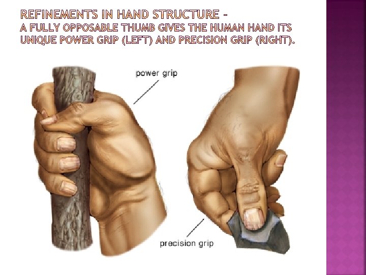 Bipedalism (moving/walking on 2 legs) Hand Functions Cranial Capacity (size of skull – determines brain size) Tool Design Tooth Size Communication - Speech, Language, Art