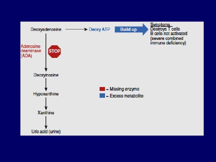 o Severe combined immune deficiency (SCID) due to adenosine deaminase (ADA) deficiency. o Lack of ADA blocks a biochemical pathway that normally breaks down a metabolic toxin into uric acid, which is then excreted. o The substance that ADA normally acts upon builds up and destroys T cells. Without helper T cells to stimulate B cells, no antibodies are made. o The child becomes very prone to infections and cancer, and usually does not live beyond a year in the outside environment.