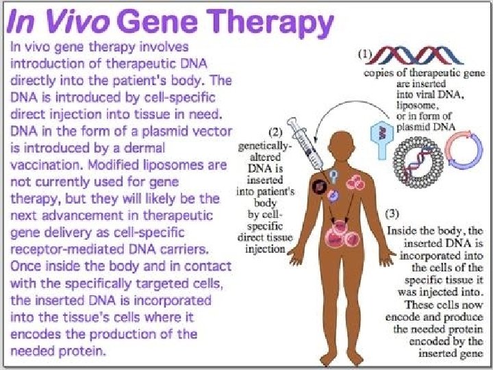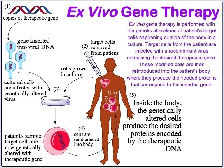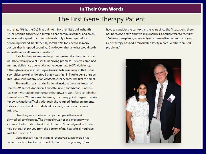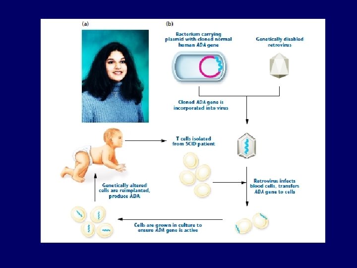 o September 14, 1990 at NIH, French Anderson and R. Michael Blaese perform the first gene therapy Trial. o Ashanti (4 year old girl) Her lymphocytes were genealtered (~109) ex vivo retrovirus vector used as a vehicle for gene introduction using to carry ADA gene (billions of retroviruses used) o Cynthia (8 year old girl) treated in same year.