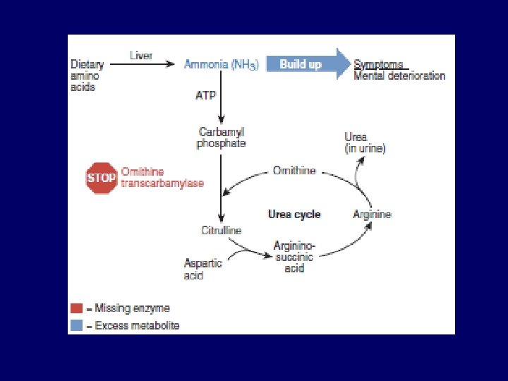 o Ornithine transcarbamylase (OTC) deficiency Urea cycle disorder (1/10, 000 births). o Encoded on X chromosome. Females usually carriers, sons have disease. o Urea cycle = series of 5 liver enzymes that rid the body of ammonia (toxic breakdown product of protein). If enzymes are missing or deficient, ammonia accumulates in the blood and travels to the brain and leads to coma, brain damage or death.