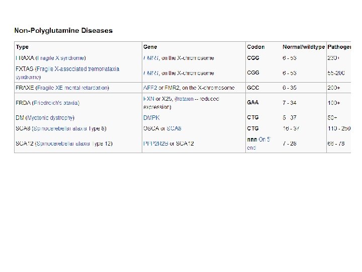 What are polyglutamine diseases? Trinucleotide repeat disorders are a set of genetic disorders caused by trinucleotide repeat expansion, a kind of mutation where trinucleotide repeats in certain genes exceed the normal, stable, threshold, which differs per gene. (If there is an expansion of CAG, which codes for Gln, then it is called a polyglutamine disease; Fragile X syndrome is caused by an expansion of CGG repeat, Huntington's disease by CAG repeat, Friedreich's ataxia by GAA repeat and Myotonic dystrophy by CTG repeat. ).