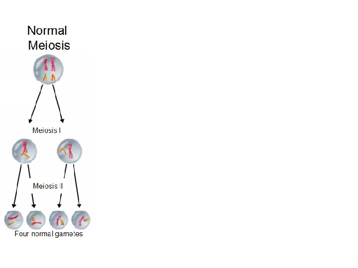 Nondisjunction • Homologous chromosomes don’t separate properly during Meiosis 1. OR • Sister chromatids fail to separate during Meiosis 2.