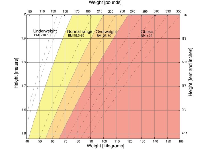Health Issues in HDC: l l l Mc. Donalds…. . obesity and overweight • • Overweight: 10 – 15 % over proper weight range – includes muscle, bone, fat and water Obese: more than 15% over proper weight range – usually due to excess fat Proper Weight Range: Body Mass Index – relationship of a person’s weight and height – BMI = (weight x 740)/(height in inches)2 Compare to accepted standards to determine underweight, healthy weight, overweight or obese