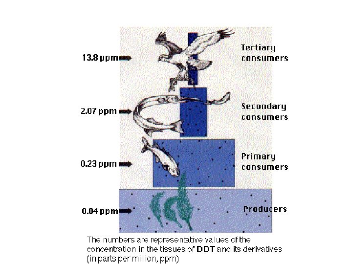 l l l Pollutants that cause the most harm are those that persist, bioaccumulate and biomagnify. Ex: DDT – Dichloro. Diphenyl. Trichloroethane – insecticide used to spray mosquitoes in order to stop the spread of malaria DDT is consumed by organisms and stored in fatty tissue In the fatty tissue it slowly degrades into DDE (Dichlorodiphenyldichloroethylene)