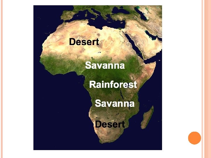 GEOGRAPHICAL DIVERSITY OF AFRICA Large deserts (Sahara and Kalahari), larger savannas or grasslands, tropical rain forest in the continent’s center, highlands and mountains in eastern Africa and small regions of Mediterranean climate in the northern and southern extremes Enormous size of continent These geographic factors ensured variation and difference among Africa’s many peoples However, continent bisected by equator and therefore overall more tropical than other land masses