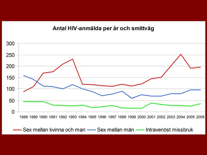 HIV – risk of transmission • Blood transfusion • Pregnancy mother/child ~100 % 15 -35 % • Iv drug abuse - sharing syringes 1 -10 % ? • Coitus (vaginal intercource) • Anal intercource <1% <3% Needle-stick incidents at hospitals Mucosal exposure at hospitals 0. 3 % 0. 09 %