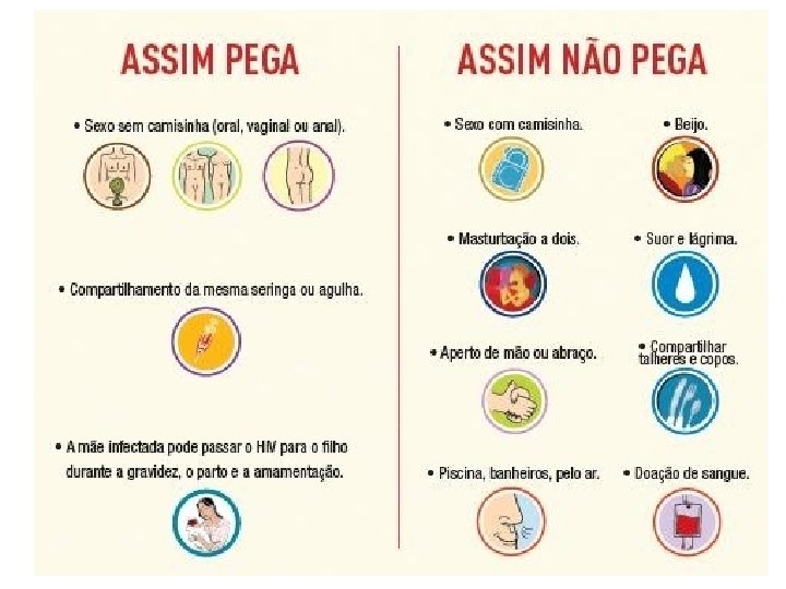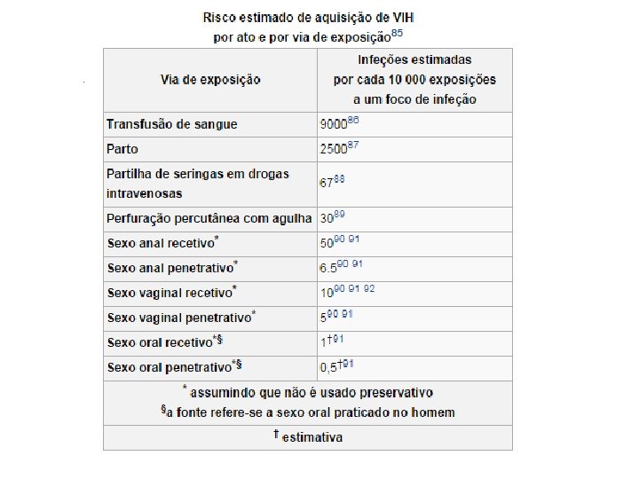 HIV - exemplos de alto risco - pessoas com contato sexual com contaminados - usuários de drogas injetáveis - crianças de mães infectadas - trabalhadores da área da saúde - laboratoristas (contato com sangue) - hemofílicos - transfusionados - pacientes de transplantes