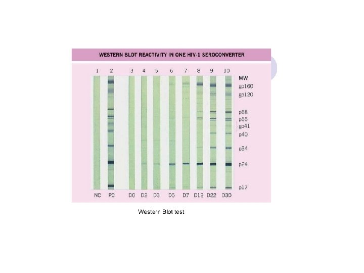 Testes não-específicos – HIV - Contagem total de linfócitos e leucócitos usualmente abaixo de 2000/m. L - Céls. T CD 4+ menos de 350/m. L - Trombocitopenia - Níveis de Ig. A e Ig. G elevados