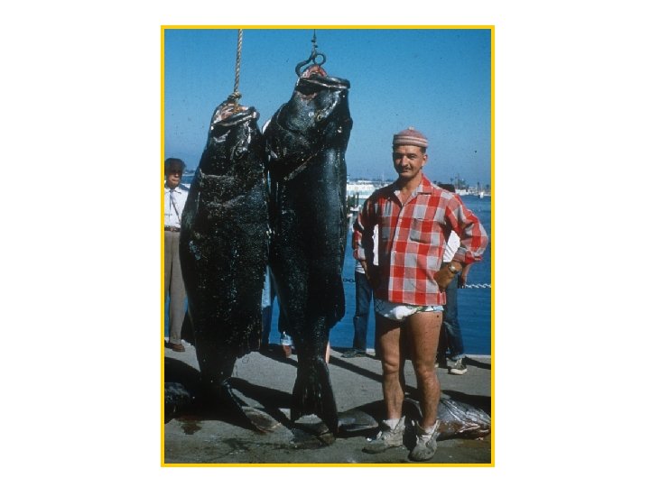 Large Fish off the San Diego Coast 1. Before 1920, large sea bass, cow cod and groupers over 6 feet in length were caught off the San Diego coast. 2. None has been seen in the area for at least 50 years. 3. Cow cod are down to <1% of their original population world wide.
