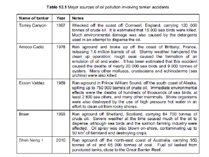 Deepwater Horizon: April 2010. 698 million liters of oil leaked into the Gulf before the well was capped oil spillage has the potential to cause massive environmental damage directly to marine organisms, food chains, sea food industries and to life along hundreds of miles of coastline.