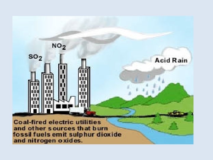 Acid Rain • The burning of fossil fuels also releases nitrogen and sulfur compounds. • These compounds combine with water vapor in the air to produce acids. • The acids then migrate for miles and fall as acid rain.