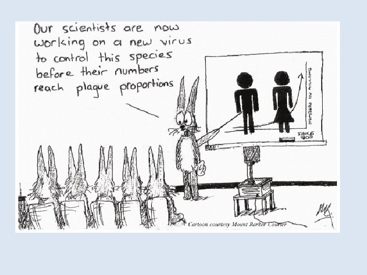 EXAMPLES OF INVASIVE SPECIES http: //psephos. adam-carr. net/countries/a/australia/images/australiamap. gif 24 rabbits turned loose for hunting in 1859 in Australia, reproduced at such a rapid rate they have taken over the continent. It is still a major problem and rabbit diseases have been purposely introduced to try to control the population http: //en. wikipedia. org/wiki/Image: Wild_rabbit. jpg